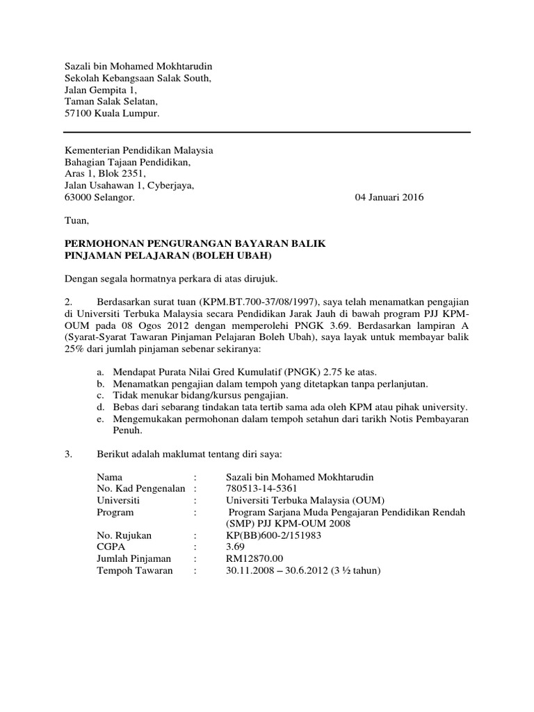 Surat Permohonan Kurang Pinjaman Pelajaran Pdf